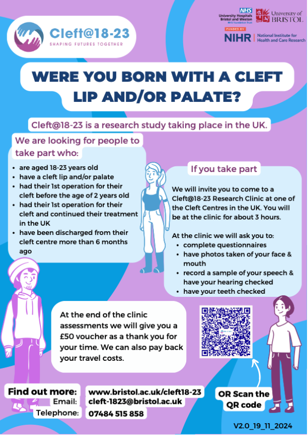 Cleft@18-23 is an NIHR (National Institute of Health Research) funded research programme which investigates outcomes at the end of routine care for 18–23-year-olds born with a cleft of the lip or palate or both.